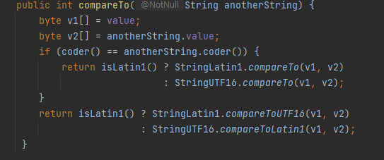์ ์ฌ์ง์ String ํด๋์ค์ compareTo ๋ฉ์๋ ๊ตฌํ ๋ถ๋ถ์ ๋๋ค. ์ ๋ ฌ์ ์ํด์๋ ๋น๊ต ๋์๊ณผ์ ๋์ ๊ด๊ณ ๊ธฐ์ค์ด ํ์ํฉ๋๋ค. ์ด๋ฌํ ๊ธฐ์ค์ด ์์ด์ผ "์ ๋ ฌ"์ด๋ผ๋ ํ์๋ฅผ ํ ์ ์๊ธฐ ๋๋ฌธ์ด์ฃ . ์ด๋ฌํ ๊ธฐ์ค์ compareTo ๋ฉ์๋์์ ์ ๊ณตํด์ฃผ๋ ๊ฒ์ ๋๋ค. "์์ "๊ณผ "๋น๊ต ๋์ ๊ฐ์ฒด"๋ฅผ ์ ์ ํ ๊ธฐ์ค์ผ๋ก ๋น๊ตํ ๋ค ๊ทธ ๊ฒฐ๊ณผ ๊ฐ์ ์์, 0, ์์๋ก ๋ฆฌํดํด์ฃผ๋ ๋ฐฉ์์ ๋๋ค.